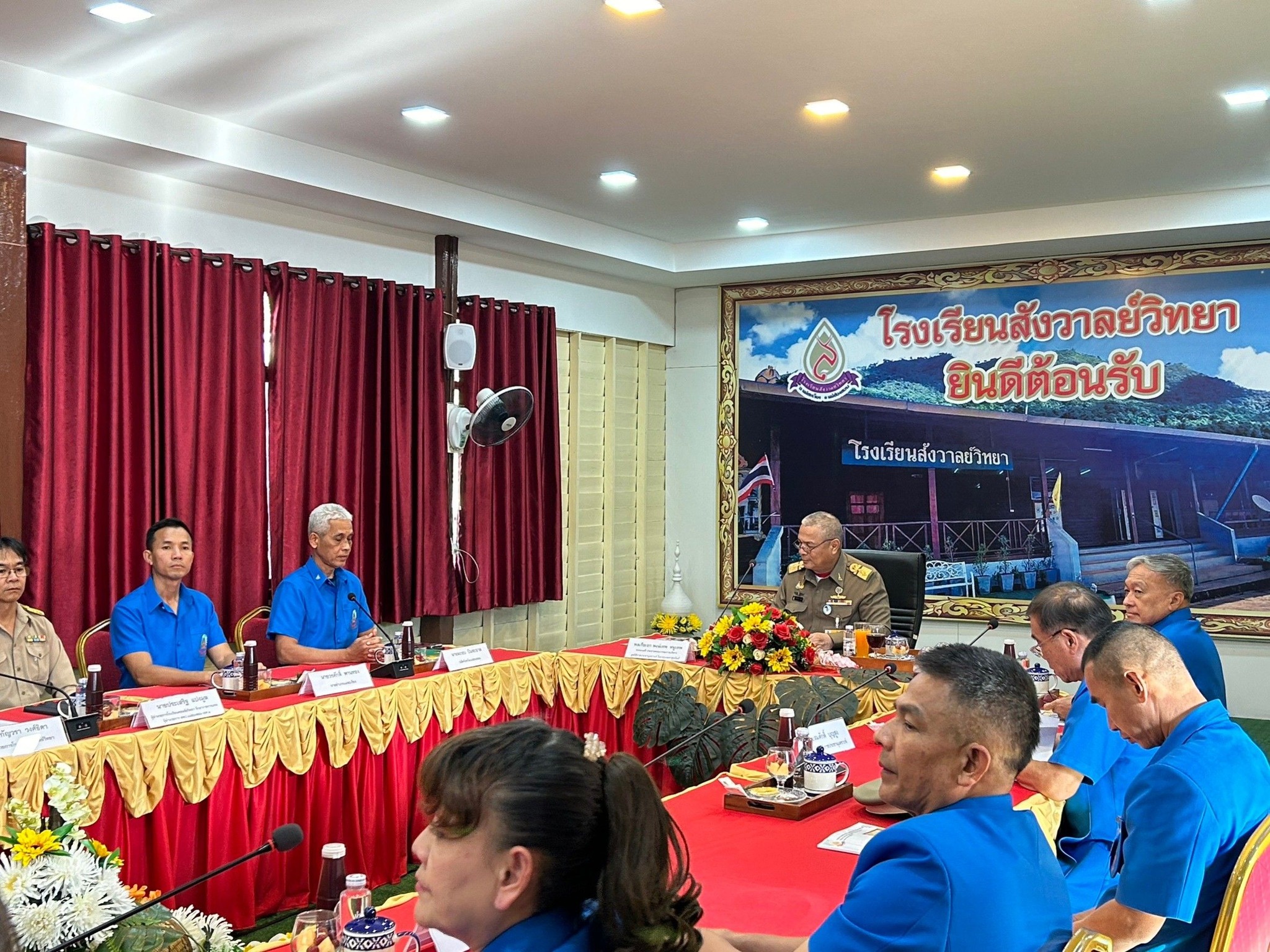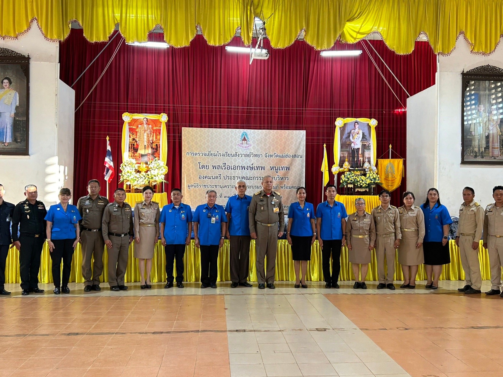 พลเรือเอก พงษ์เทพ หนูเทพ องคมนตรี ประธานกรรมการบริหารมูลนิธิราชประชานุเคราะห์ ในพระบรมราชูปถัมภ์ ที่เดินทางมาตรวจเยี่ยมโรงเรียนสังวาลย์วิทยา ณ หอประชุมศรีสังวาลย์ โรงเรียนสังวาลย์วิทยา ต.แม่เหาะ อ.แม่สะเรียง จ.แม่ฮ่องสอน